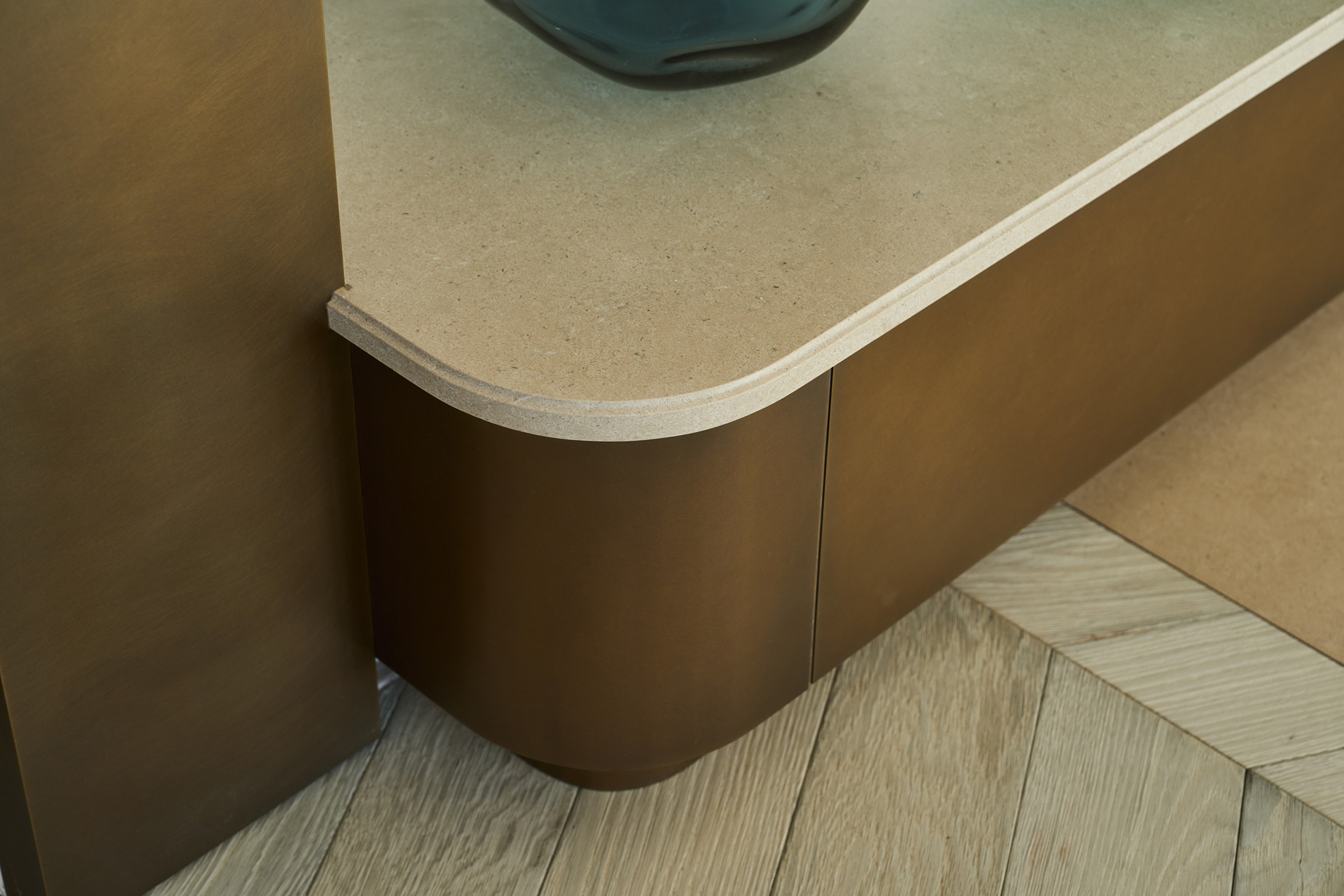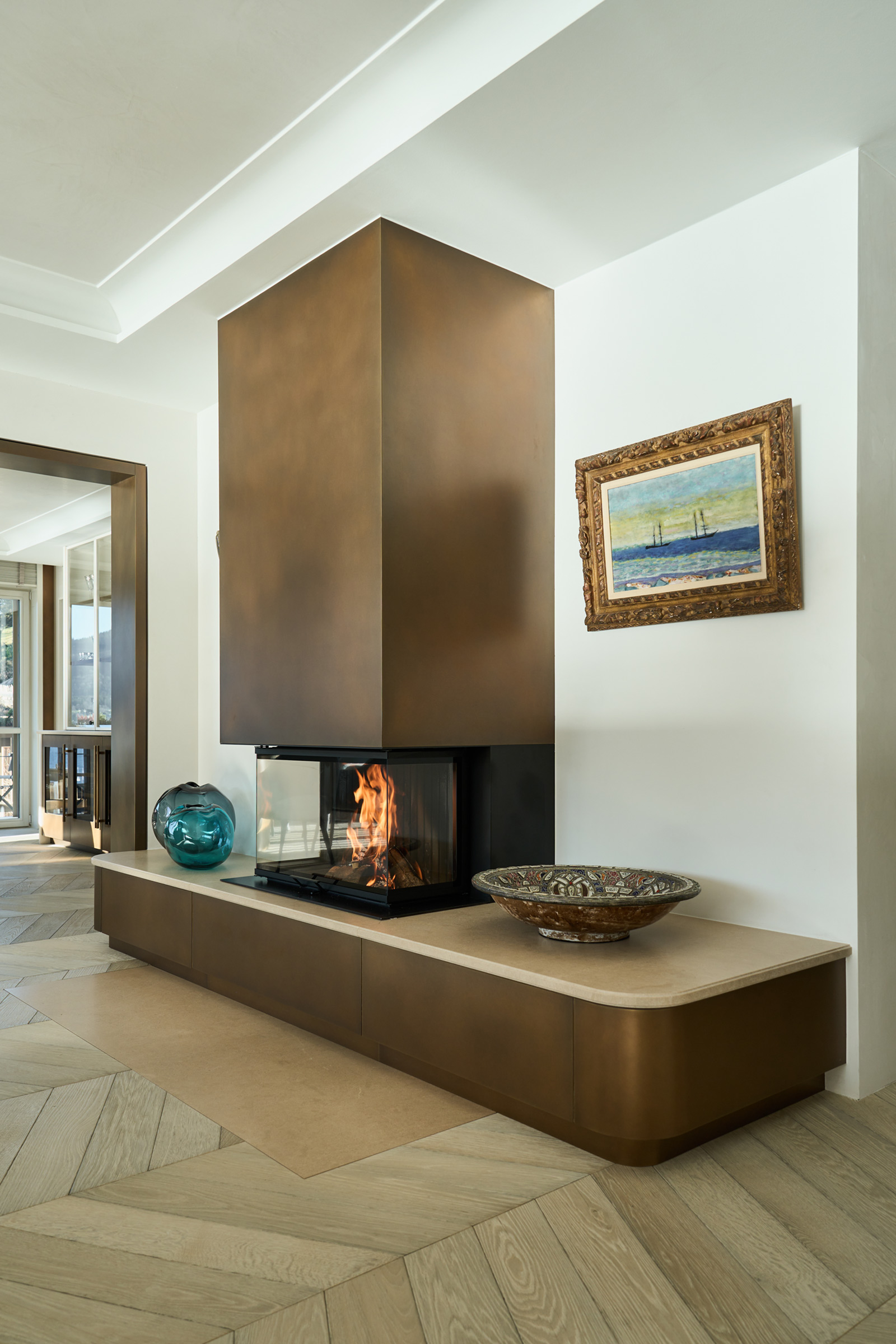 Die Messingverkleidung verleiht dem Kamin eine warme, edle Ausstrahlung, die je nach Lichteinfall lebendig changiert und dem Raum eine besondere Tiefe gibt. Die sanften Rundungen im Sockel nehmen dem massiven Material die Strenge und verleihen dem Panoramakamin eine zeitlose Eleganz. So verbindet er repräsentative Größe mit wohnlicher Weichheit - perfekt für ein Haus, das Geschichte und Moderne vereint.